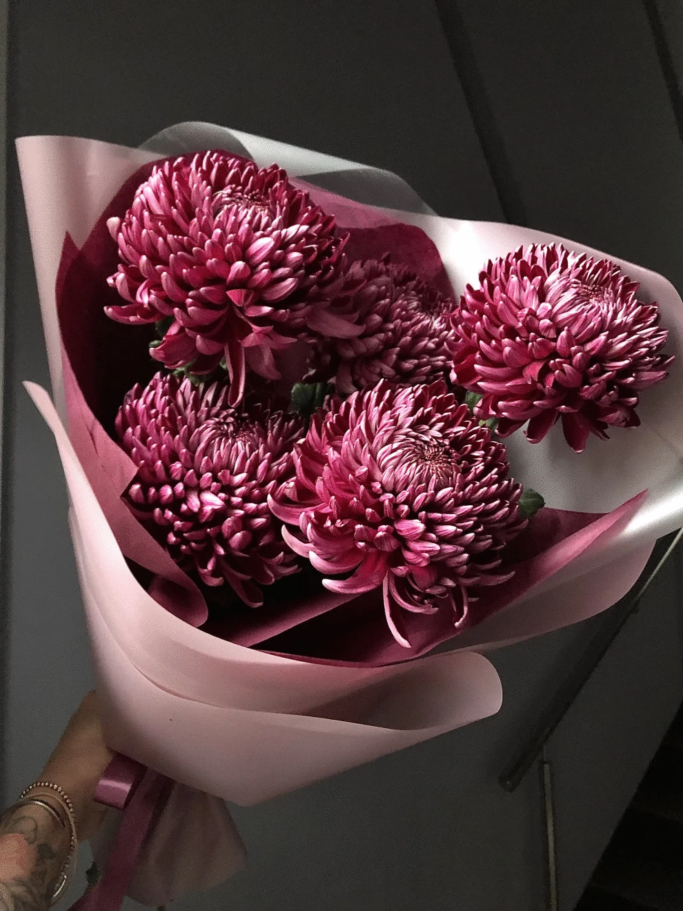 Букет из сезонных крупных хризантем Бигуди с доставкой на дом. Букет из этих хризантем приятно удивит и станет отличным подарком для родных и близких, он подойдет как на день рождения так и по любому другому поводу!