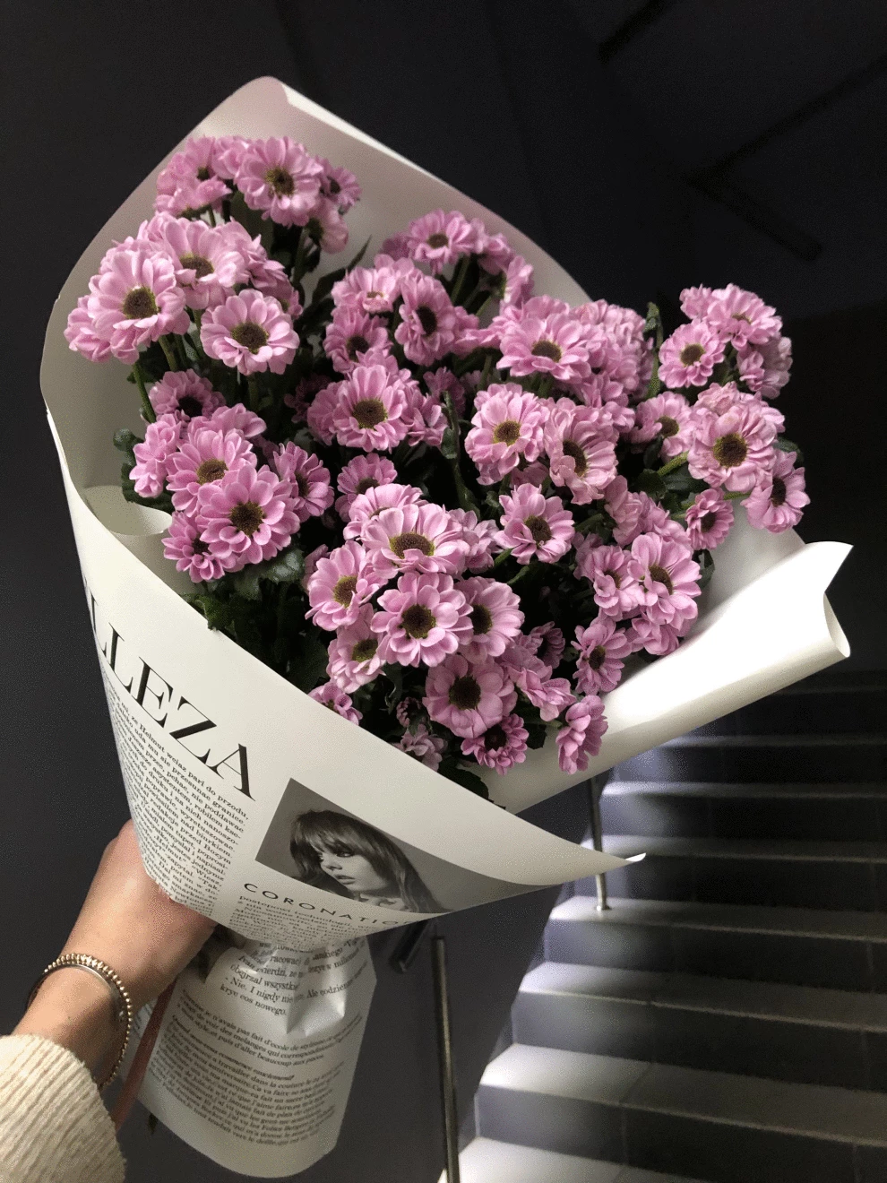 Букет из лиловых кустовых хризантем Сантини с доставкой в городе Клин. Такой букет станет отличным подарком для родных и близких, он подойдет как на день рождения так и по любому другому поводу!