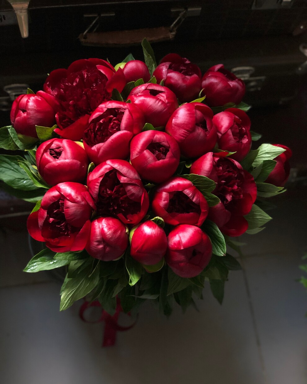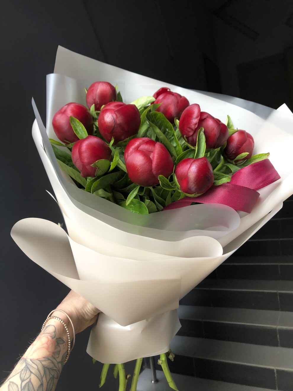 Букет из чувственно темно бордовых, словно сочная спелая черешня, пионов сорта Ред Шарм!