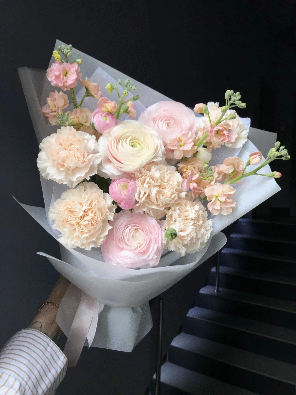 Светлый и нежный букет с нежно-персиковыми гвоздиками и маттиолой, и нежными ранункулюсами.
