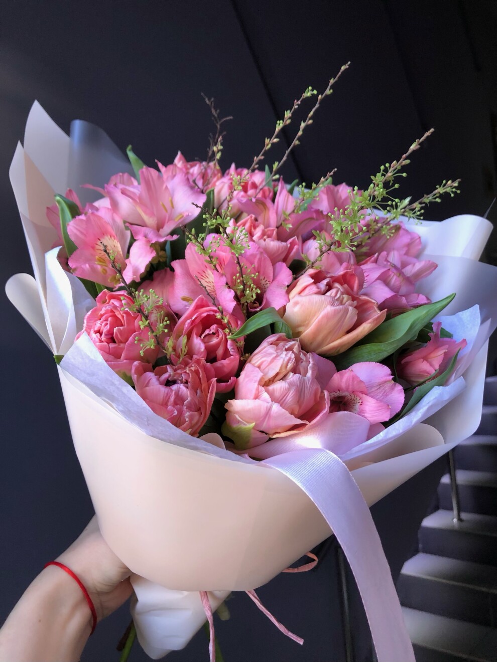 Состав букета: тюльпаны,альстромерия, цветущие веточки, упаковка, атласная лента.