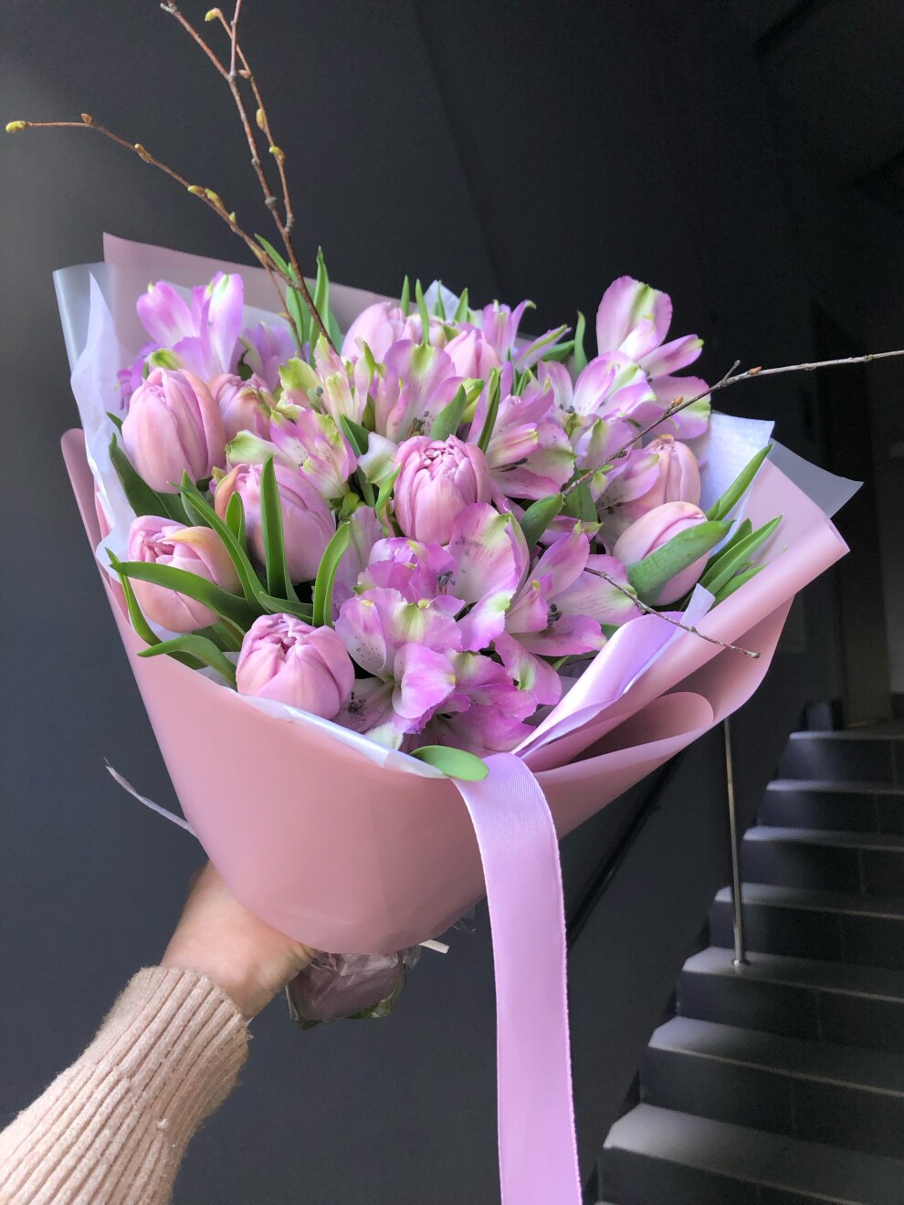 Состав букета: тюльпаны,альстромерия, цветущие веточки, упаковка, атласная лента.