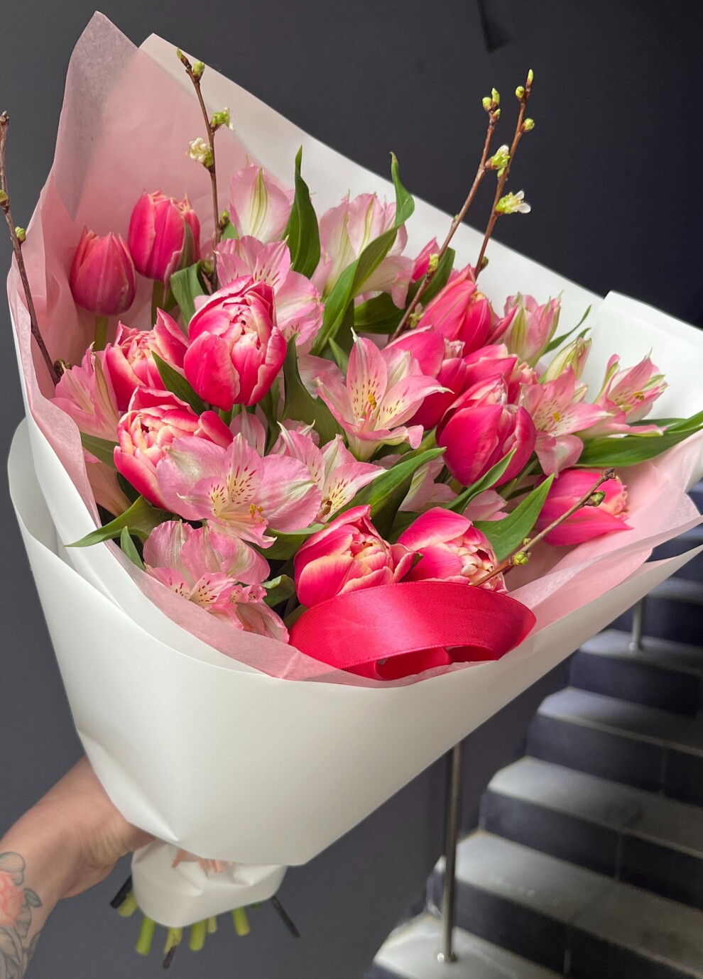 Состав букета: тюльпаны,гениста, упаковка, атласная лента.