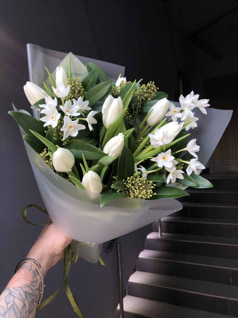 Весенний букет с белыми тюльпанами, скимией и нарциссами