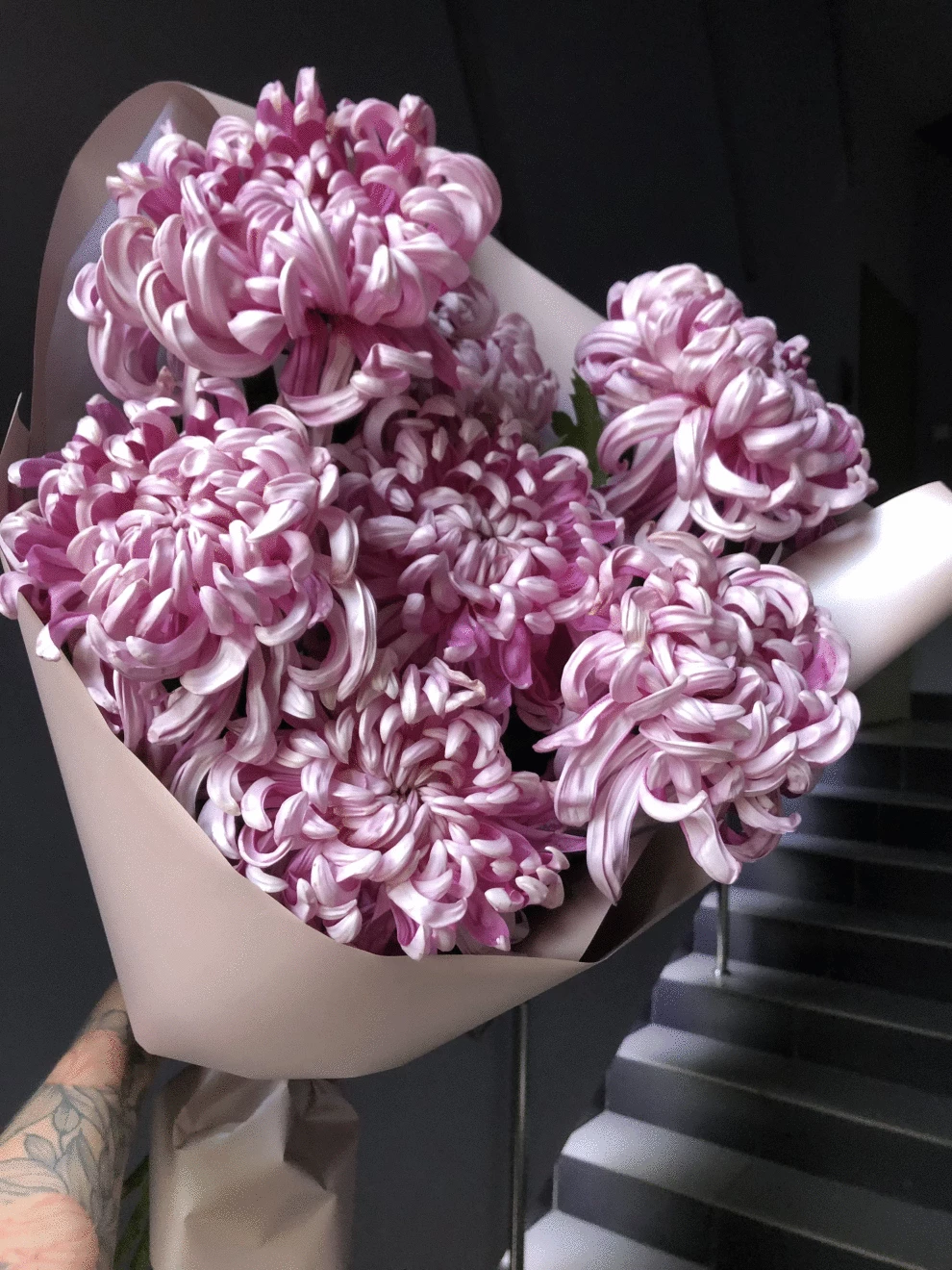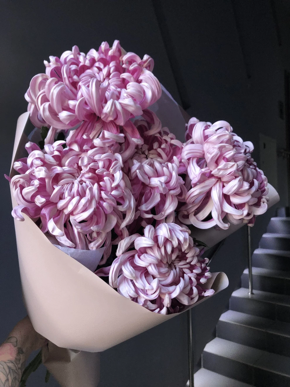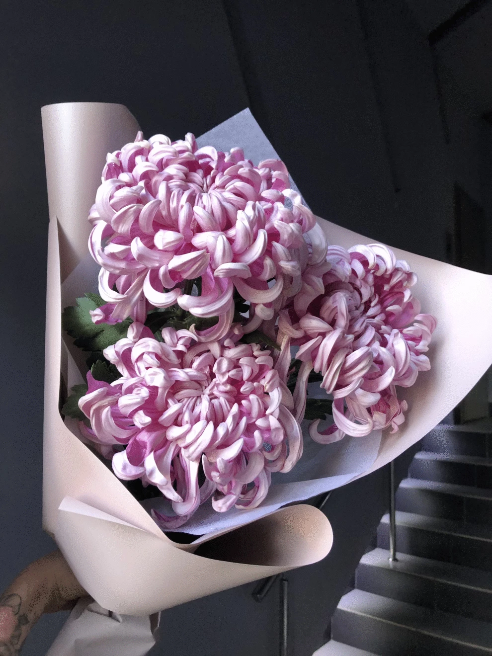 Букет из сезонных невероятных крупных розовых хризантем сорта "Виена пинк" с доставкой в городе Клин. Такой букет произведет впечатление и станет прекрасным подарком для родных и близких, он подойдет как на день рождения так и по любому другому поводу!