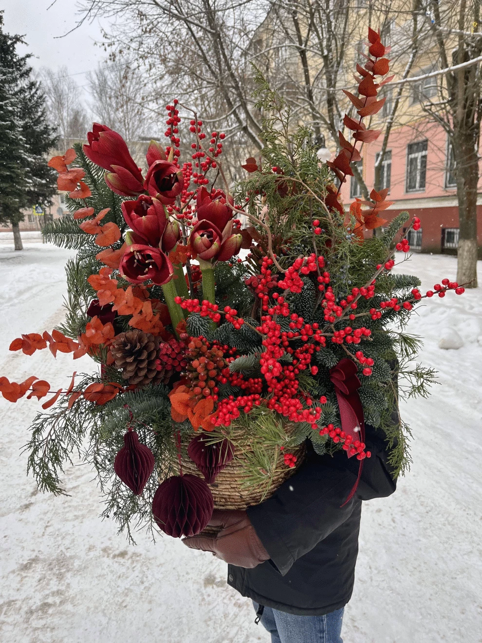 Композиция выполнена из нобилиса, красного илекса с стабилизированным экалиптом, красными амариллисами и новогодним декором, собирается на флористической губке оазис, что придает ей свежий вид долгое время.