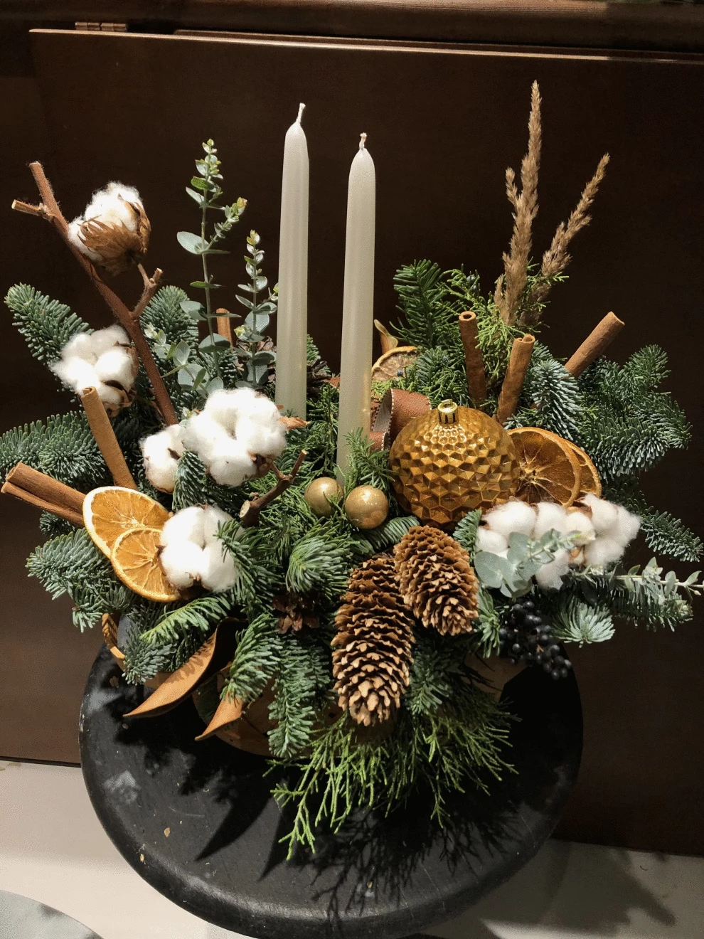 Композиция выполнена из нобилиса, с сушеными апельсинами, корицей, шишками, новогодними украшениями, хлопком, эвкалиптом и свечами, собирается на флористической губке оазис, что придает ей свежий вид долгое время.