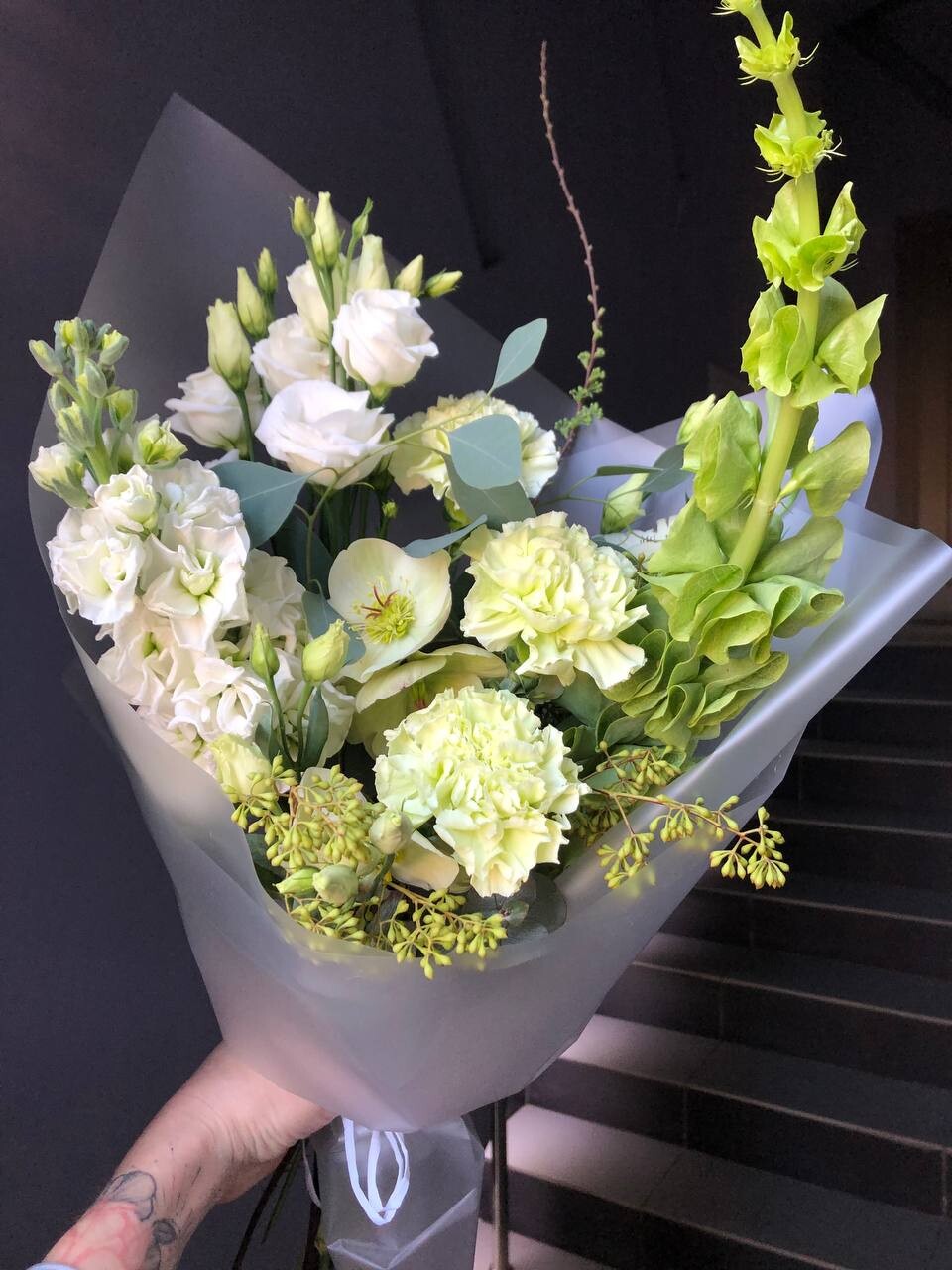 В составе: маттиола, эустома, хелеборус, гвоздика, молюцелла