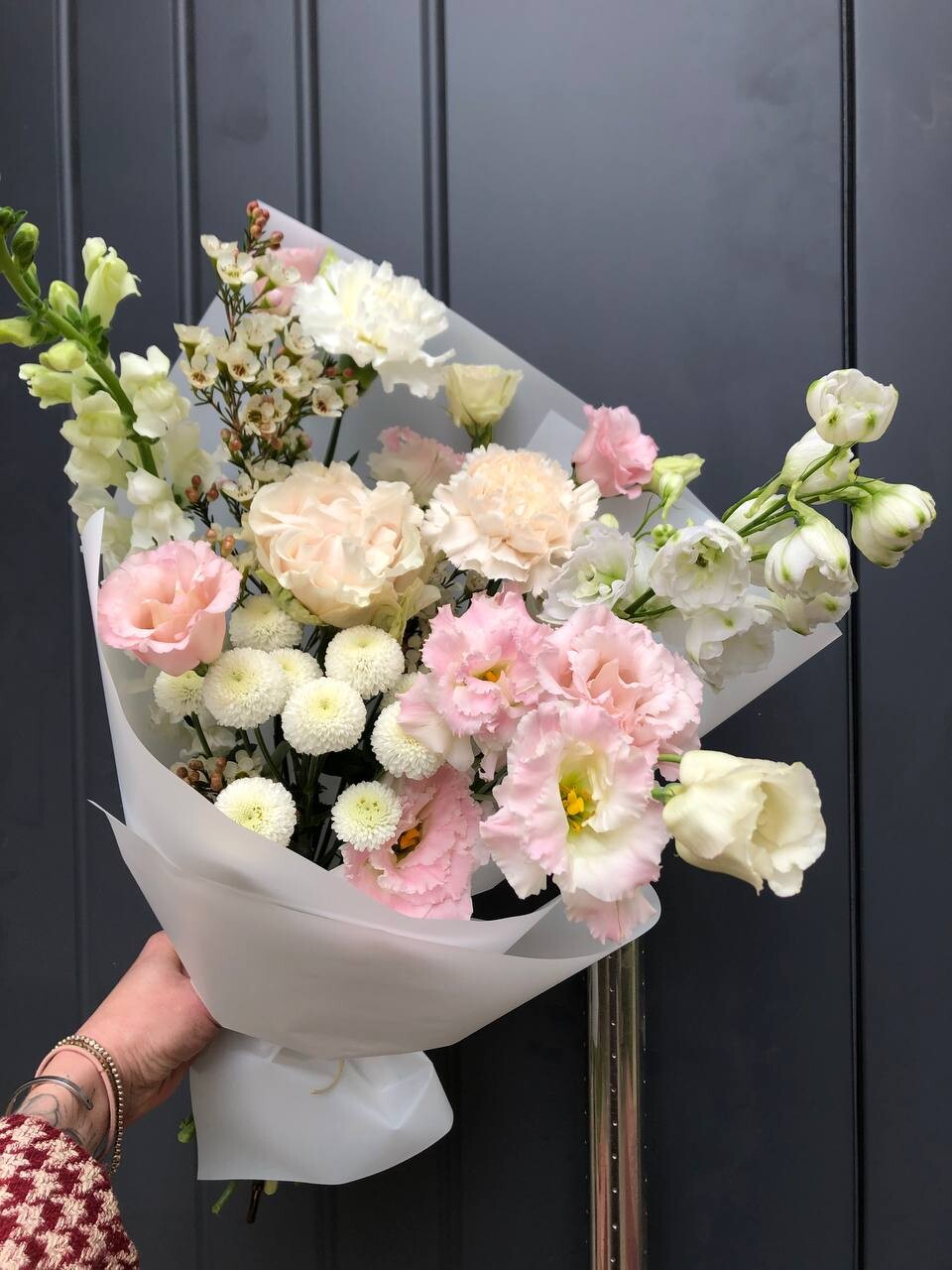 Светлый и нежный сезонный букет с нежно-персиковыми гвоздиками, дельфиниумом и шамилациумом.