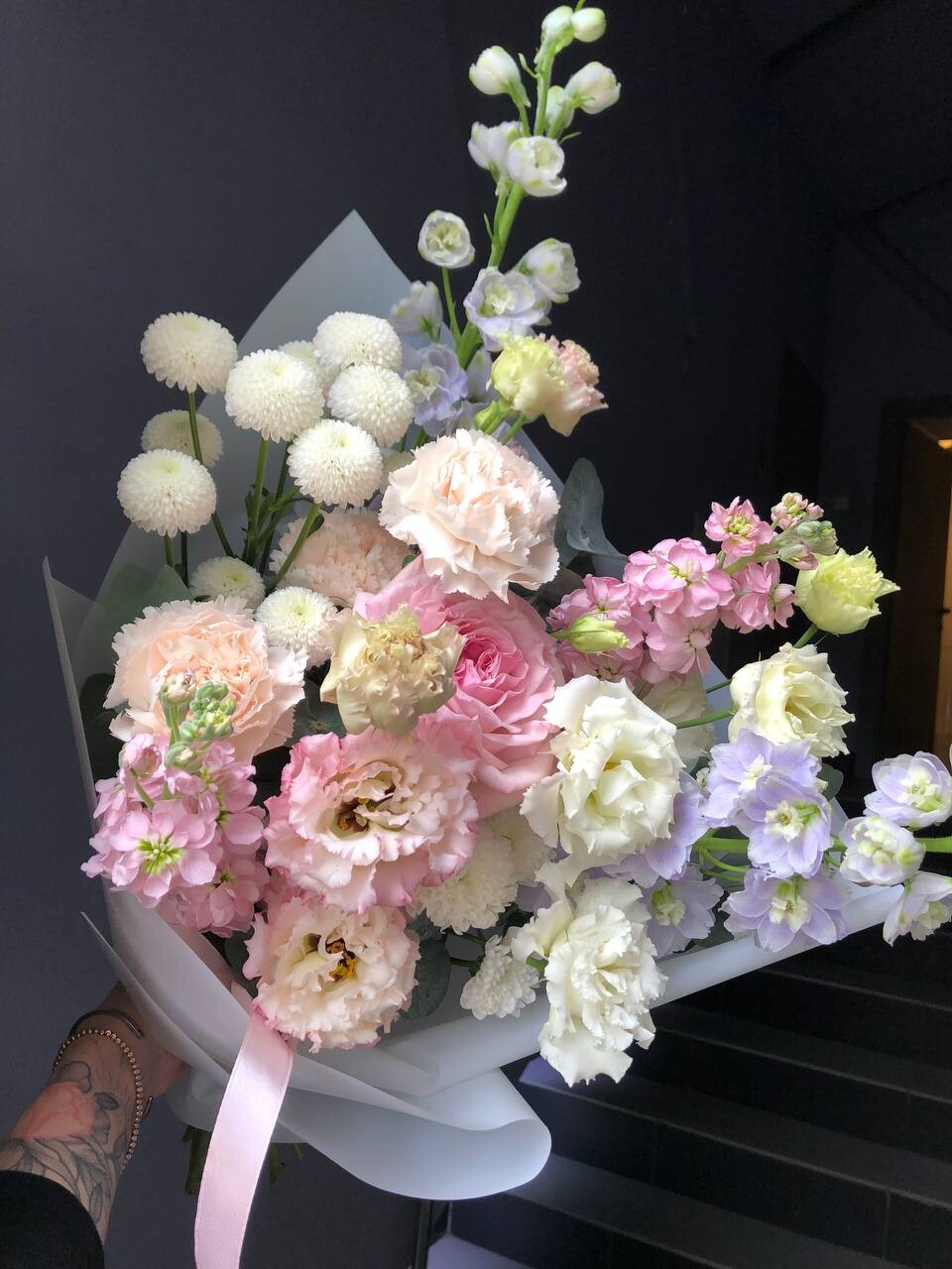 Светлый и нежный сезонный букет с нежно-персиковыми гвоздиками, ароматной розовой охарой, маттиолой и голубым дельфиниумом.