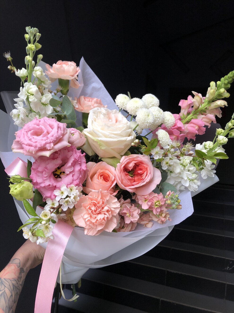 Насыщенный весенний сезонный букет. В составе: пионовидная роза Охара, пионовидная роза Пинк экспрешн, антирринум, дельфиниум, маттиола, эустома и гвоздика